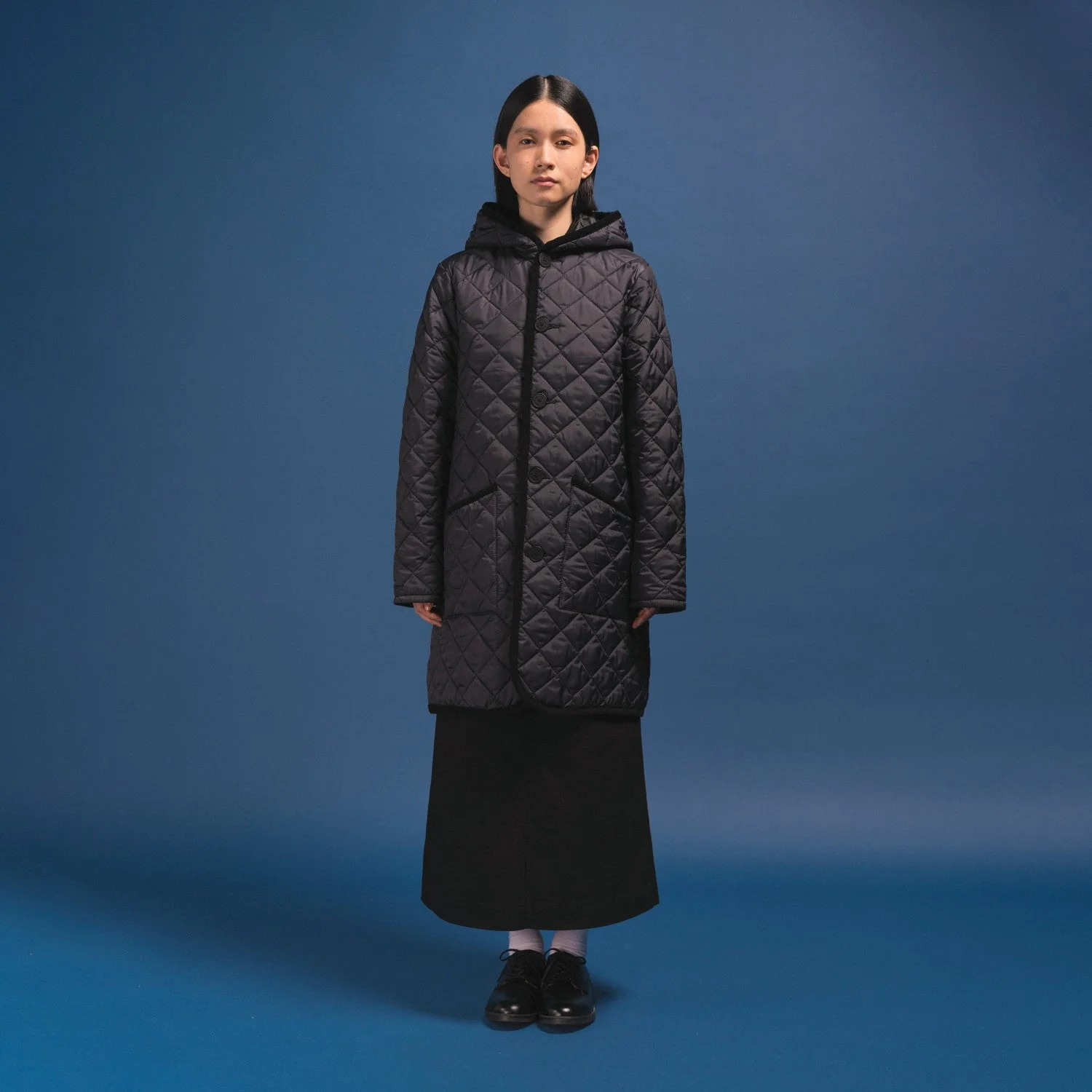 裾にかけて徐々に広がるAラインのシルエット、フードが特徴的。