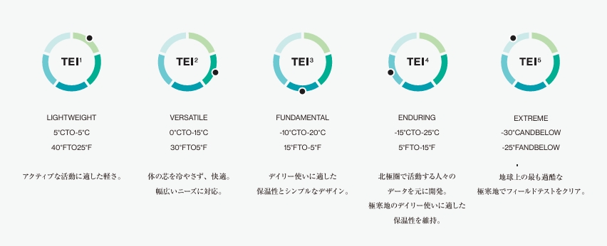 評価システムは5つに分かれており、アクティブに動き回るための軽量ジャケットから、極寒の地でのフィールドテストに合格したパーカまで、TEI指数を目安にお客様自身のニーズに沿った、製品を見つけるのに役立てることが出来ます。