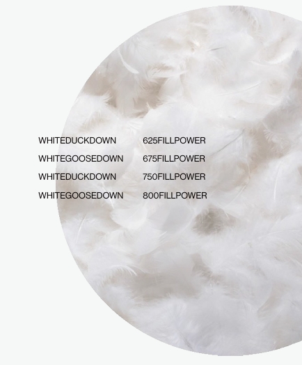 各製品の用途や素材に合わせて、グースとダックの高品質な原料を最も適した独自のバランスで、4 種類の異なるフィルパワーのダウンを選定、配合し、最大限のパフォーマンスが発揮できるよう工夫がなされています。